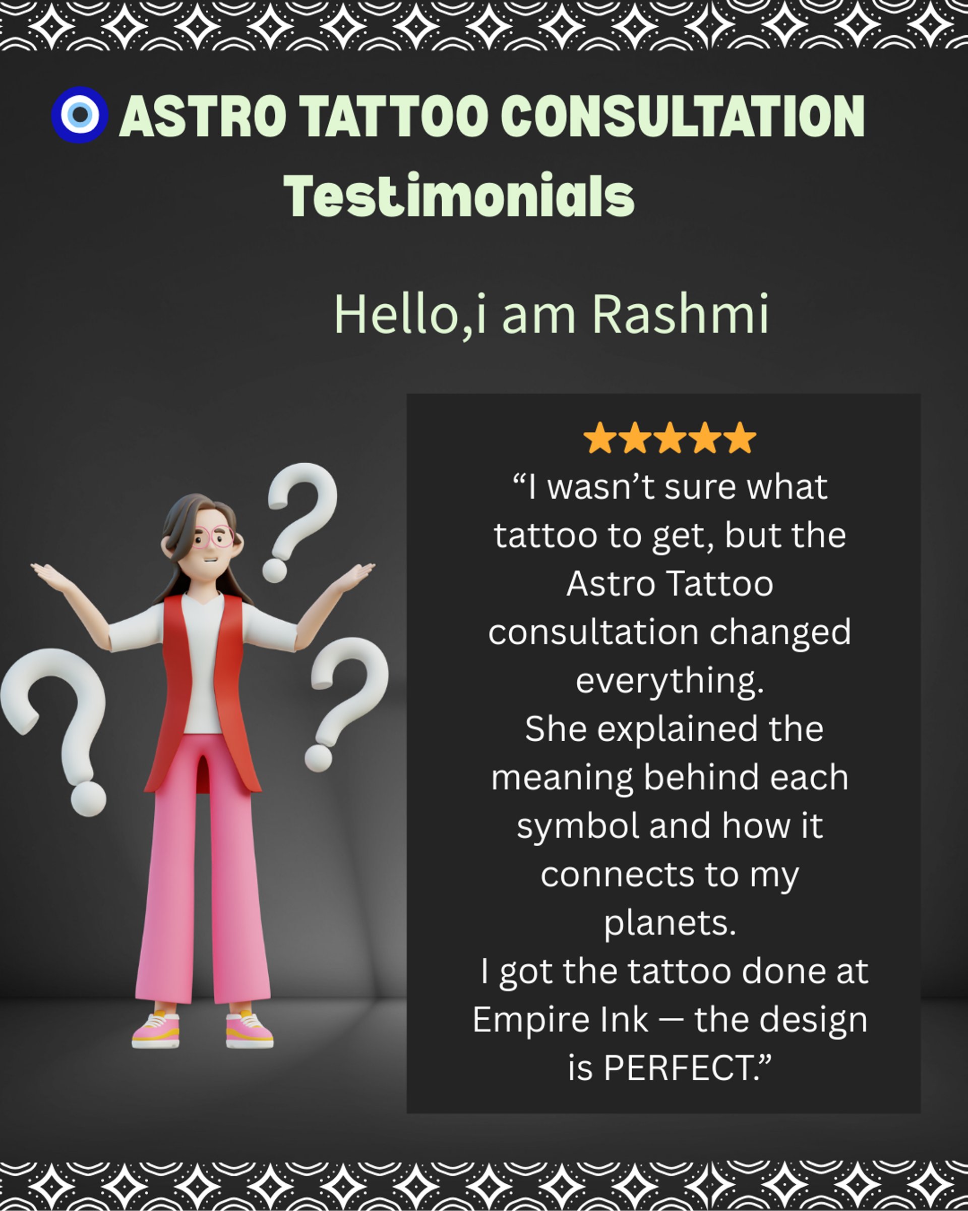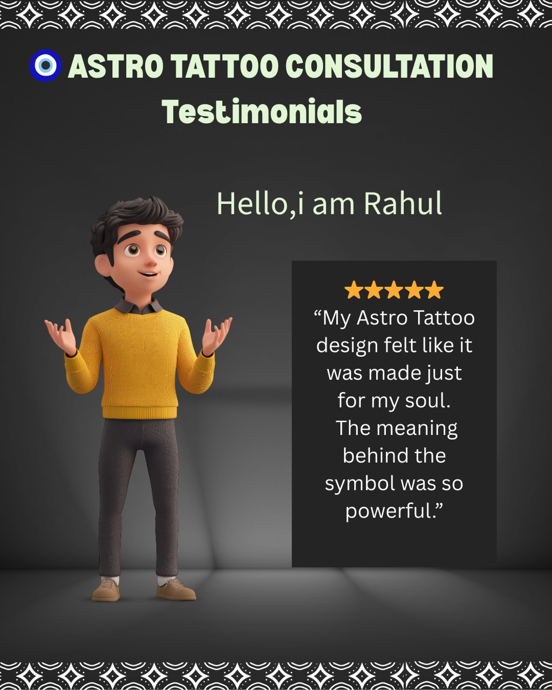 Astro Tattoo With Remedy is a personalized astrology-based tattoo guidance service that combines astrology, numerology, and symbolic remedies to help align your energy with supportive planetary influences. Based on your birth details, suitable tattoo symbols, elements, and placements are suggested along with their meanings, timing, and the purpose behind the tattoo — so your tattoo becomes a source of energy, intention, and transformation.
