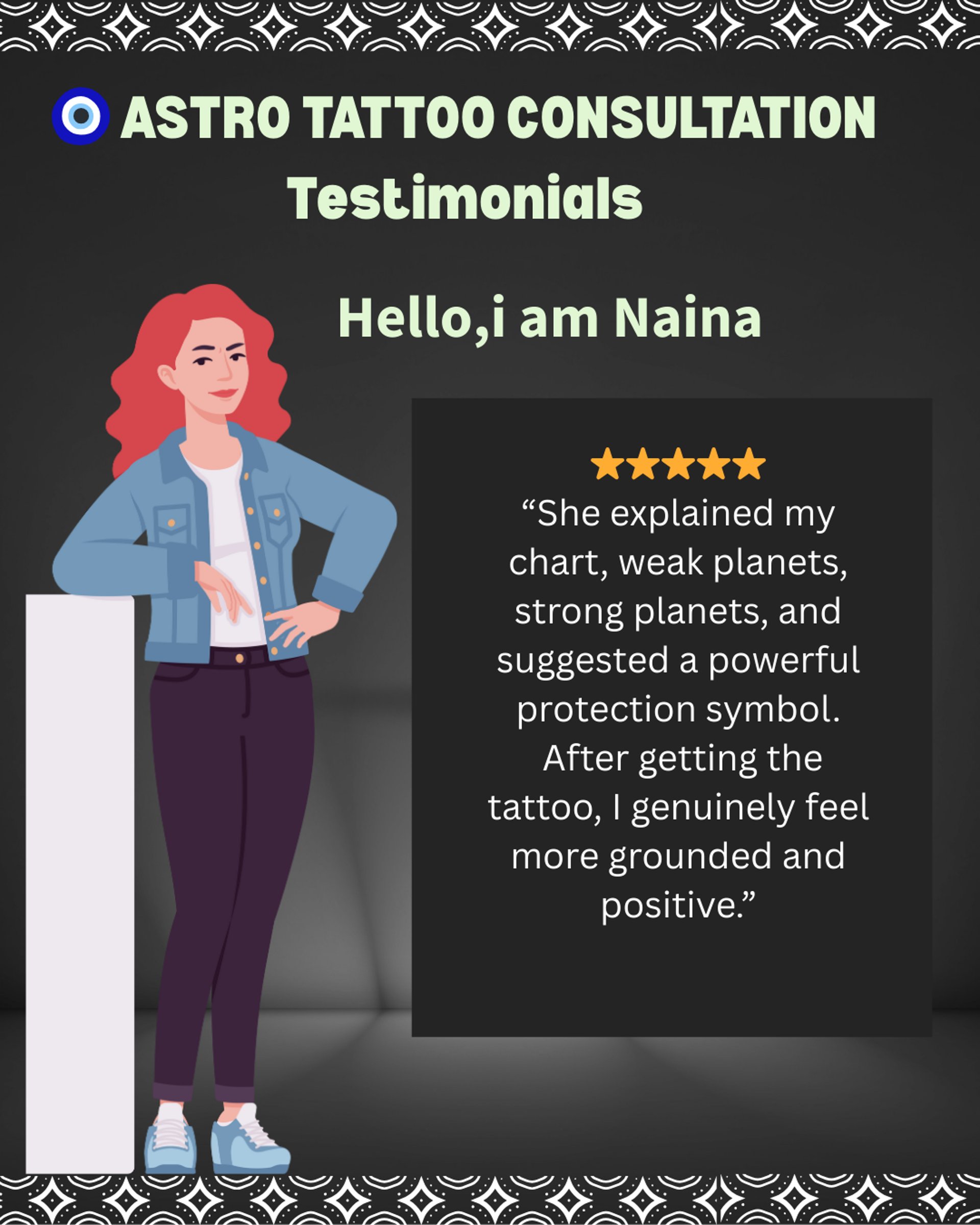 Along with tattoo suggestions, you receive practical remedies such as mantras, colors, lifestyle adjustments, and energy-balancing practices to support clarity, confidence, and emotional stability.