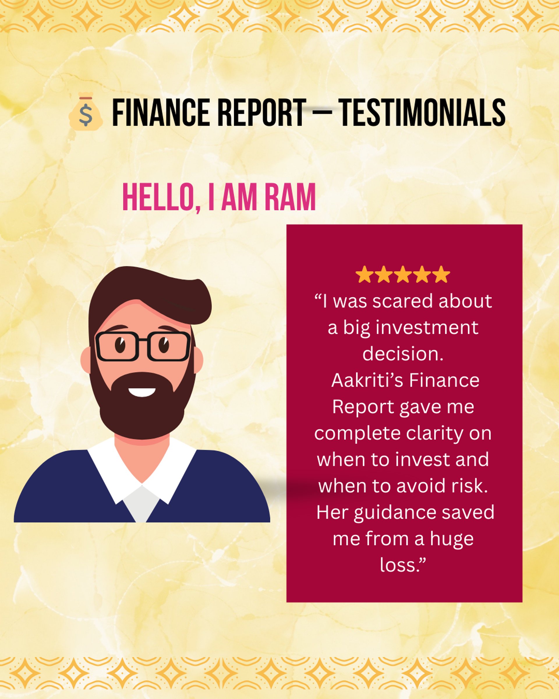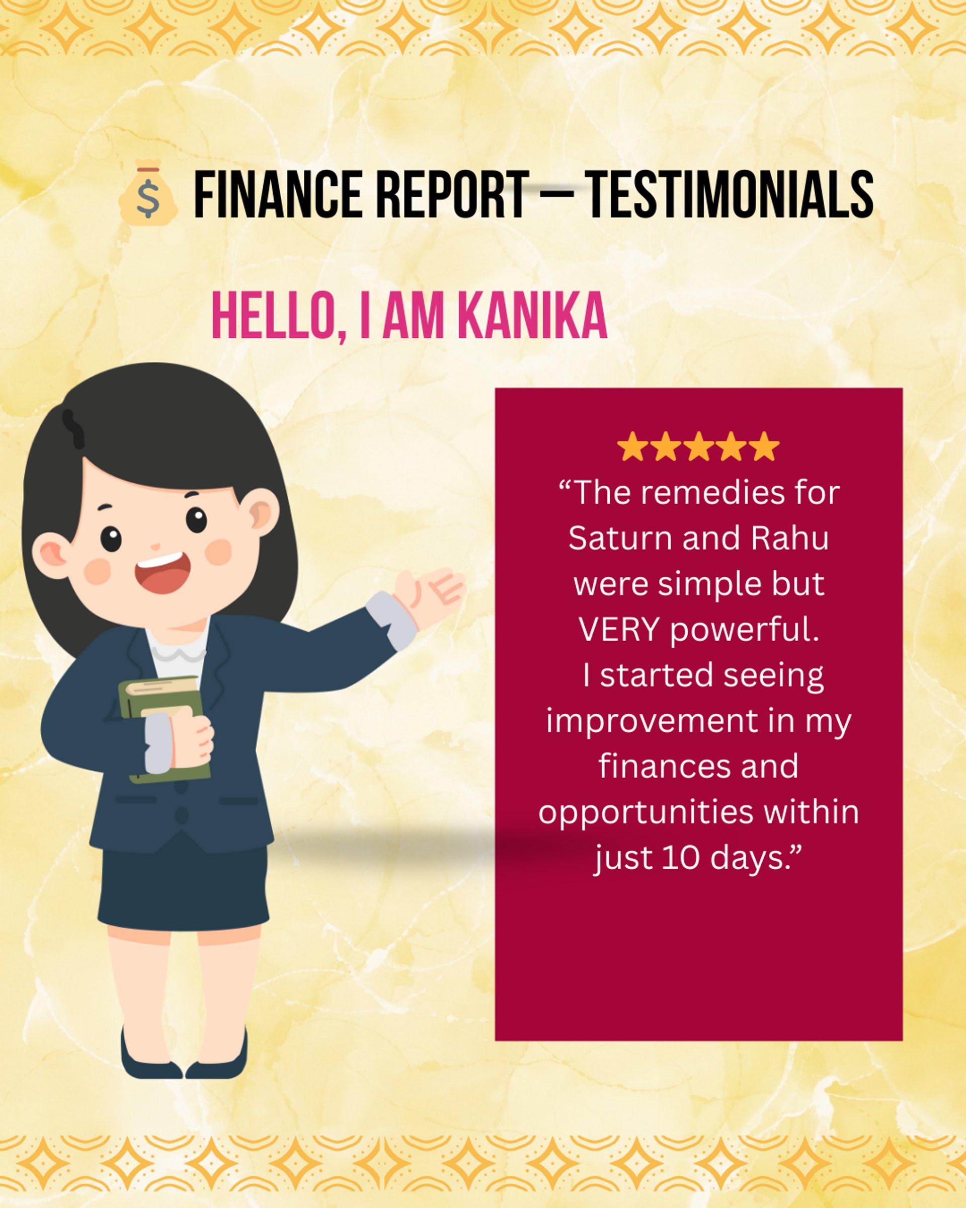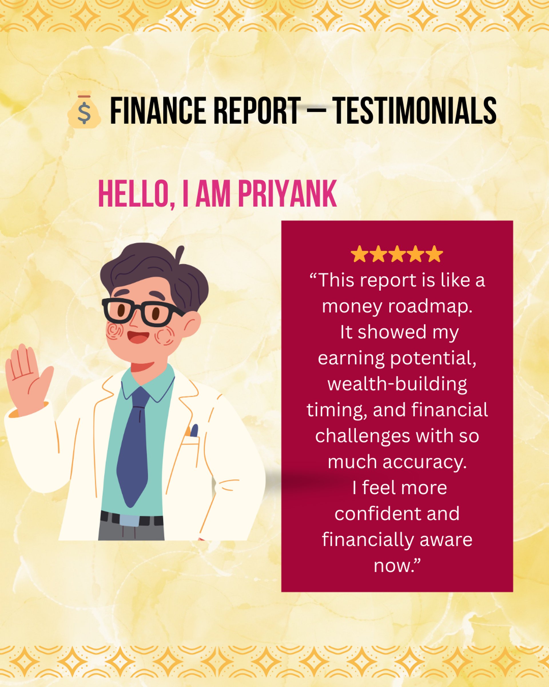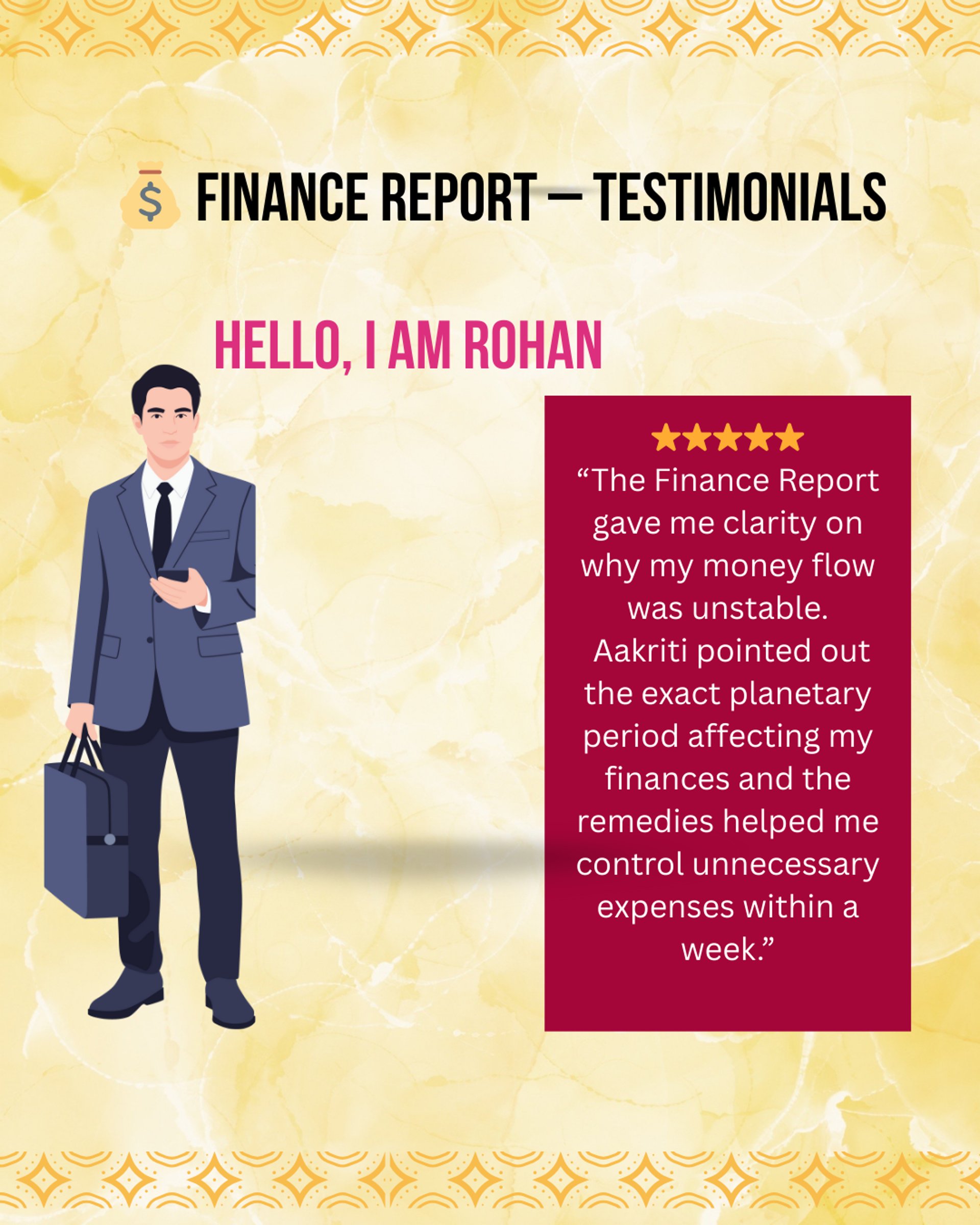 A Finance Report is a personalized astrology-based guide that reveals your earning potential, money flow, savings habits, financial strengths, and challenging periods. It explains how your planets influence income, career money, business growth, debt, investments, and long-term wealth creation. This report helps you understand why financial patterns occur and gives clarity on the best timing for financial decisions so you can plan your money wisely and avoid unnecessary risks.